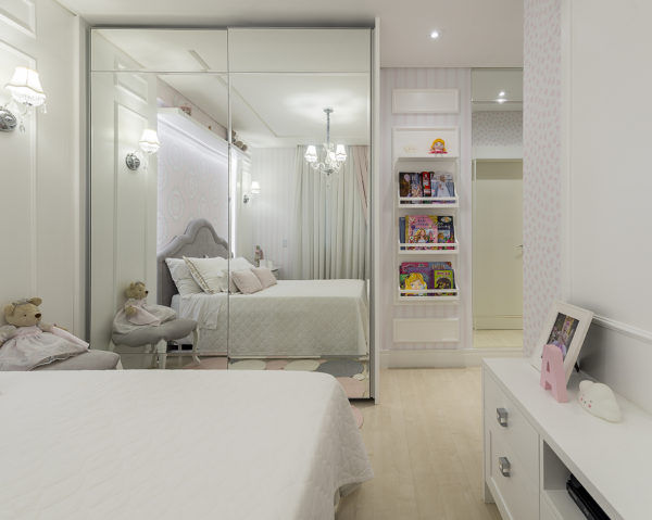 Enquanto o espaço da caçula se destaca pelo visual mais infantil e delicado, o ambiente projetado para a irmã, de cinco anos, é clássico como um quartinho de princesa. Boiseries com lustres de cristal, painéis iluminados e penteadeira com espelho veneziano criam uma atmosfera elegante ao ambiente, misturando tudo que existe de mais sofisticado.